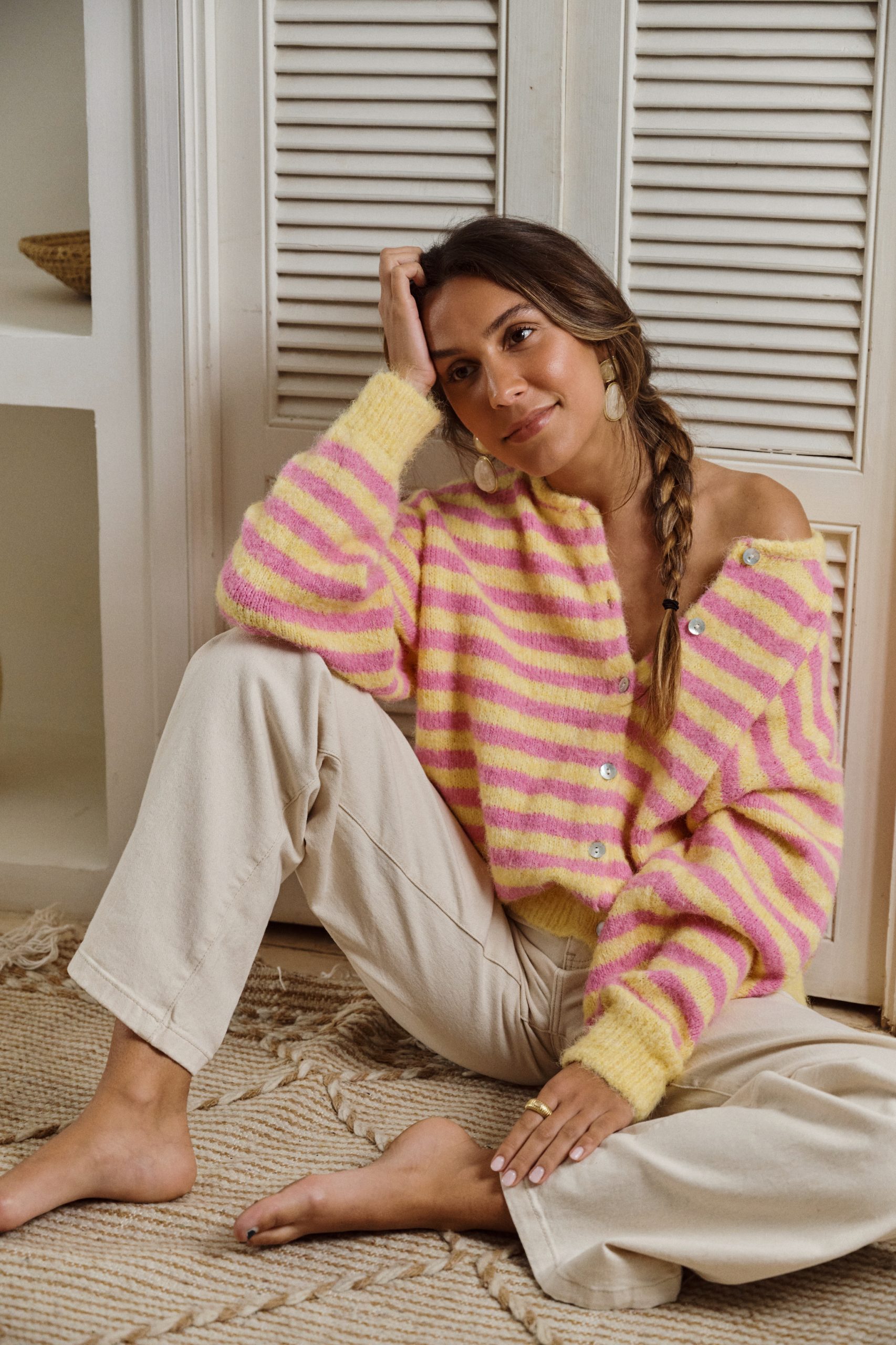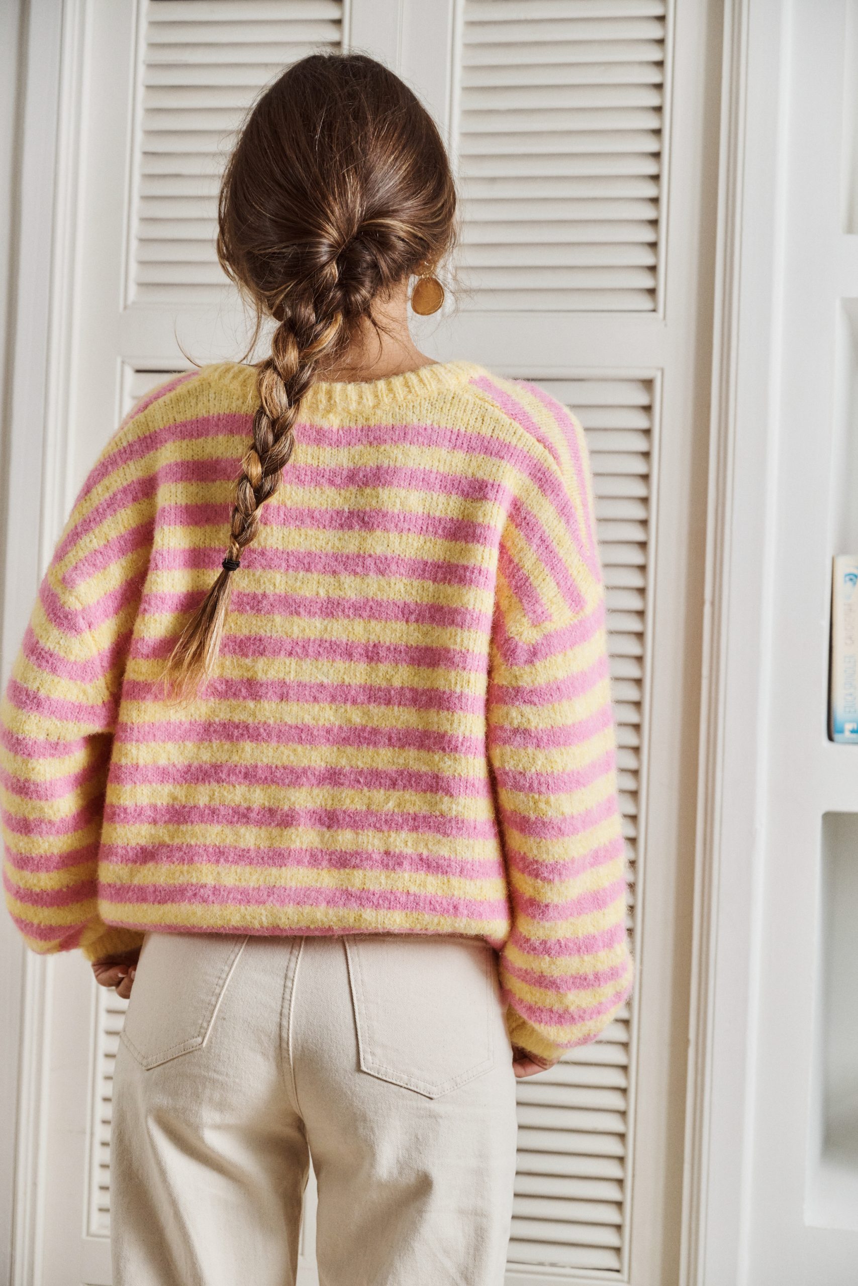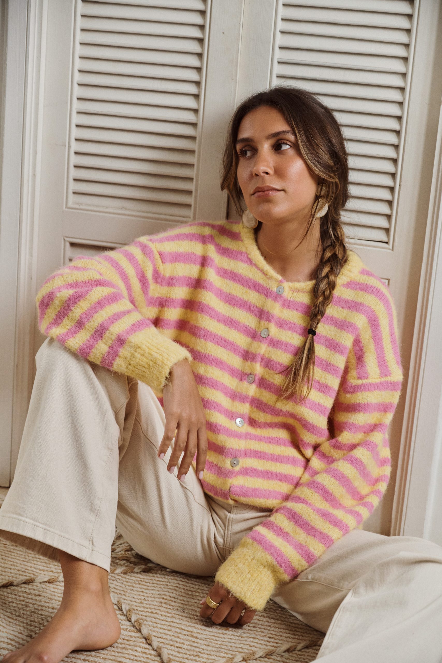 Gilet Camille Sahoma rayée rose et jaune en maille et boutonné, manches longues, portée avec un jeanGilet Camille Sahoma rayée rose et jaune en maille et boutonné, manches longues, portée avec un jean
