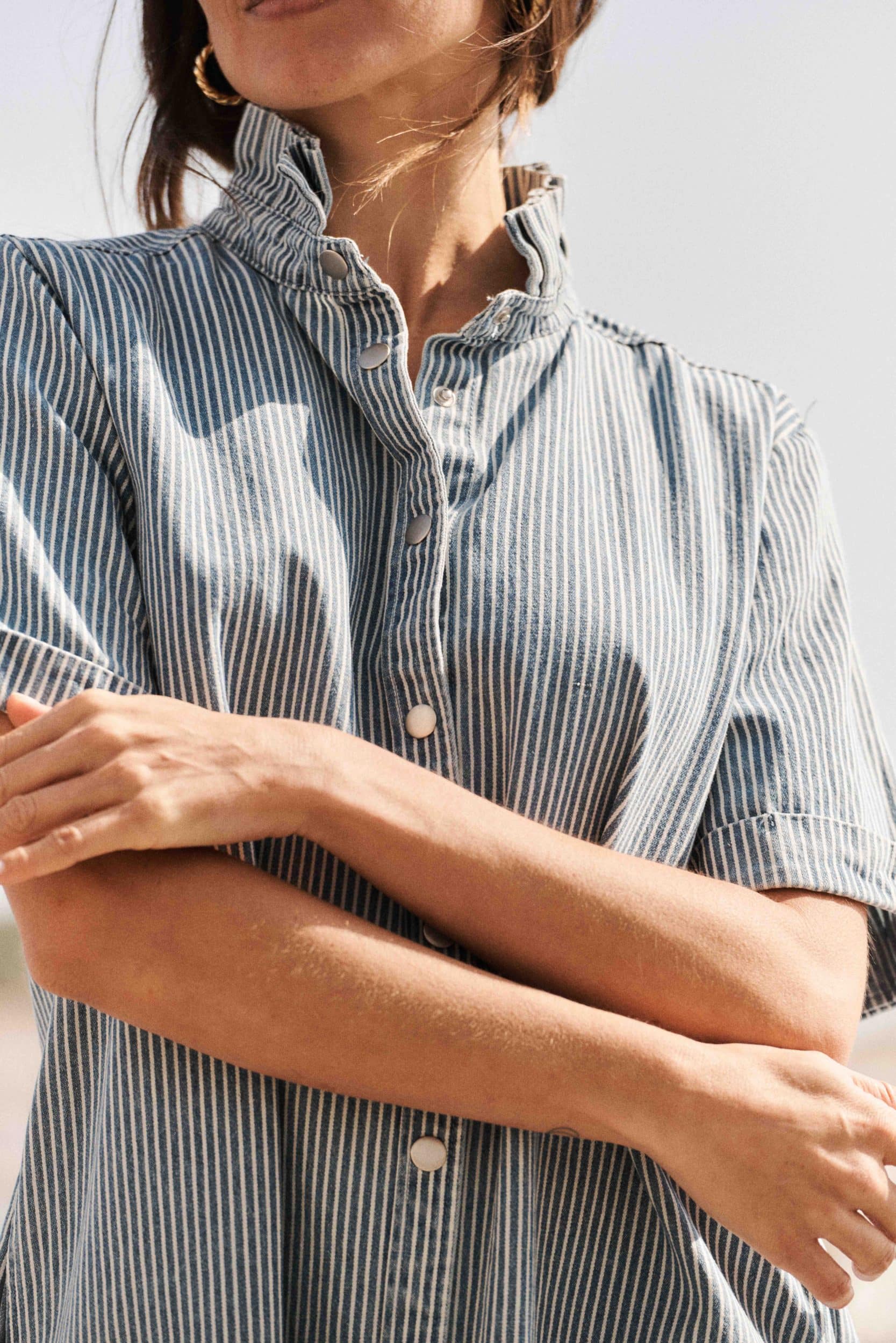Robe Asia rayée bleue Sahoma, col montant à volants, coupe droite courteRobe Asia rayée bleue Sahoma, col montant à volants, coupe droite courte
